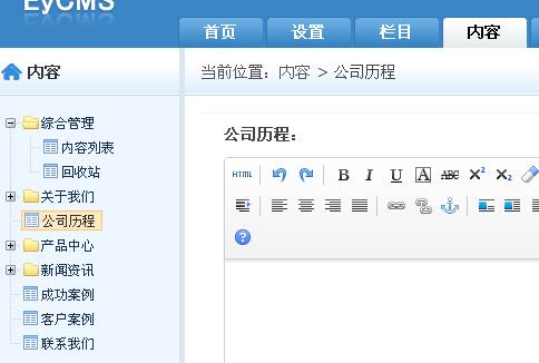 選擇【內(nèi)容】,點擊左側(cè)【公司歷程】后,右側(cè)會變成編輯框,然后我們只需要把想要添加的內(nèi)容寫入編輯器里面,之后點擊【保存】前臺頁面欄目內(nèi)容就會變成您所編寫的